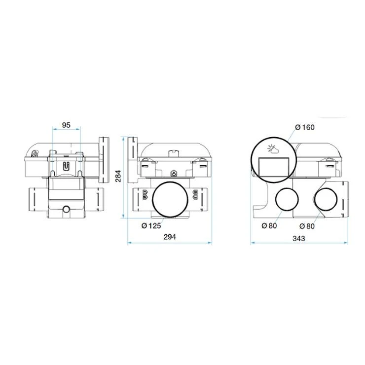 - Ø160 ou Ø125 mm pour le rejet, grâce à l’adaptateur fourni.