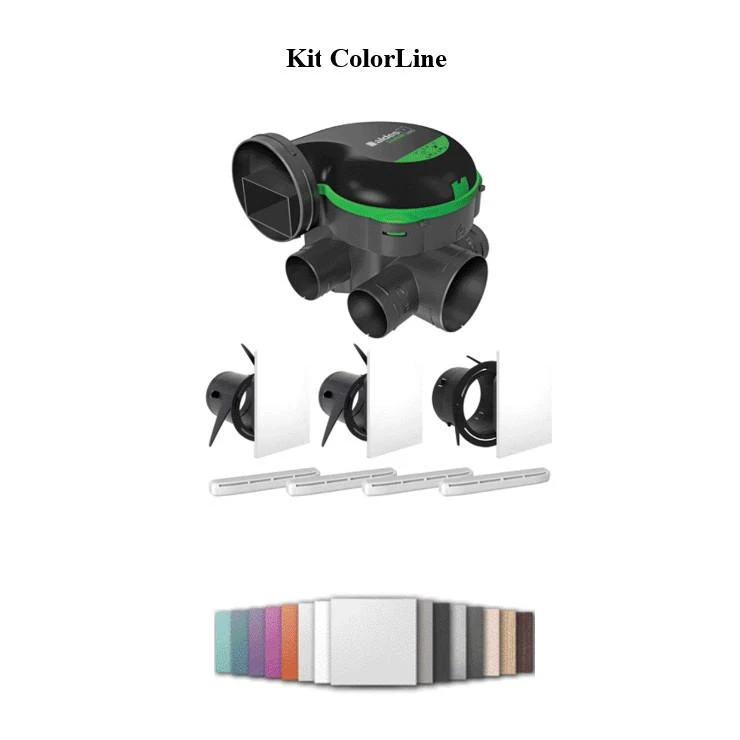 Ce kit VMC Aldes EasyHOME PureAIR est composé du groupe de ventilation, de 3 bouches hygroréglables pour la cuisine, WC et salle de bains + bouchons, raccords et colliers.