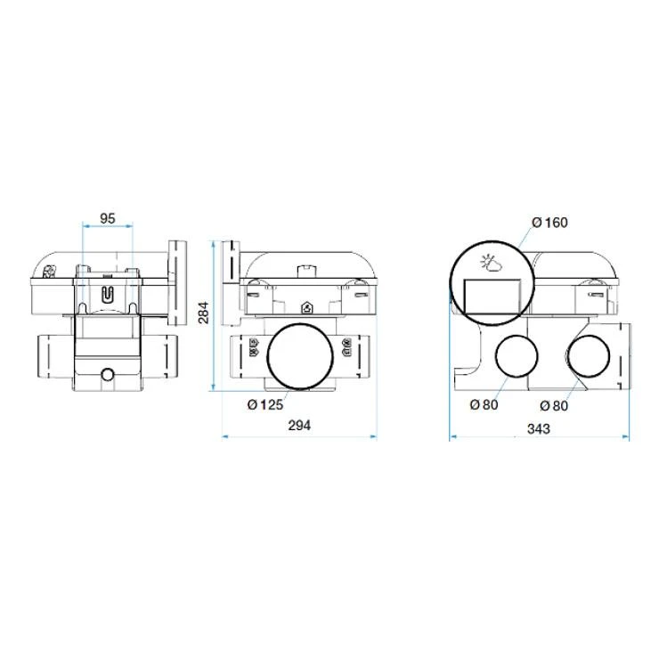 - Ø160 ou Ø125 mm pour le rejet, grâce à l’adaptateur fourni.