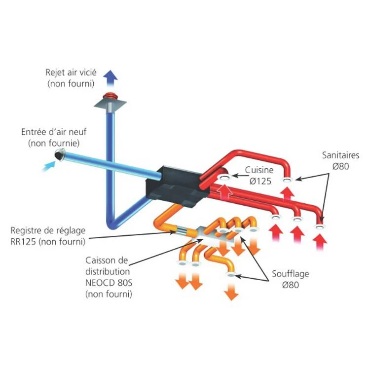- 3 piquages rejet, prise d’air neuf et insufflation Ø125