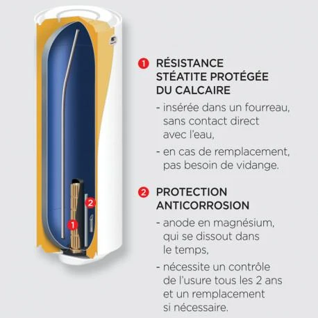 - Résistance stéatite insérée dans un fourreau pour limiter l’entartrage, facilement accessible et démontables sans vidange