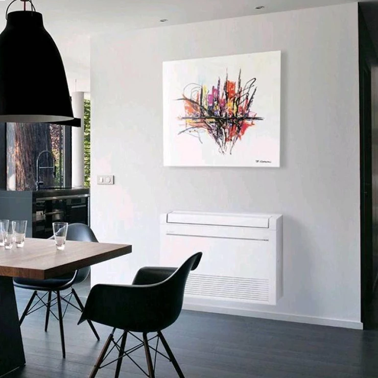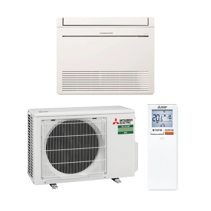 L’ensemble mono-split MFZ-KT-VG + SUZ-M-VA est constitué d’un groupe extérieur à poser au sol ou à fixer au mur (support sol ou mural à commander en complément), et d’une unité intérieure de type console qui s’installe en partie basse d’un mur (idéal en remplacement d’un radiateur électrique).